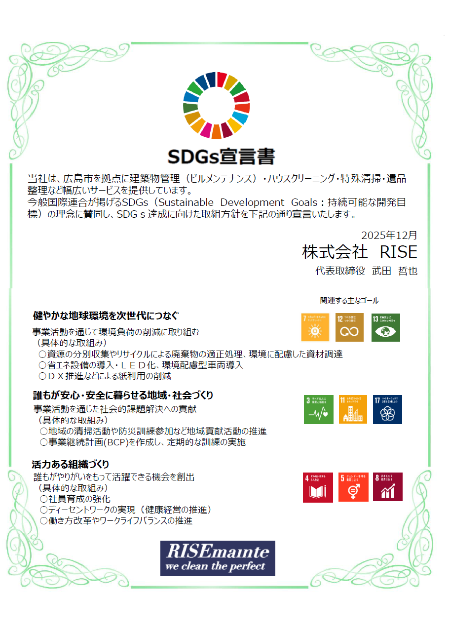 株式会社RISEは、広島市を拠点に建築物管理(ビルメンテナンス)・ハウスクリーニング・特殊清掃・遺品整理 など幅広いサービスを提供しています。